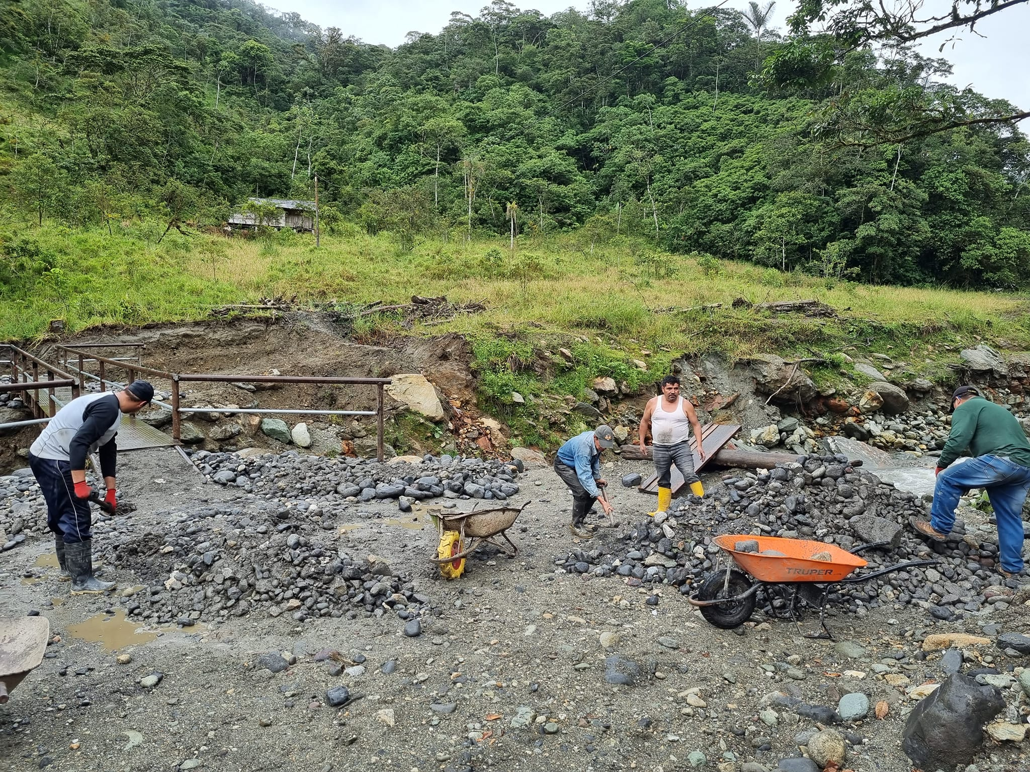 Moradores del Sector Las Estancias en coordinación con el Gobierno Parroquial de Río Negro, realizan trabajos de minga en la construcción del puente Peatonal. Informa. Edgar Zabala Jaramillo, Presidente del GADPRN.