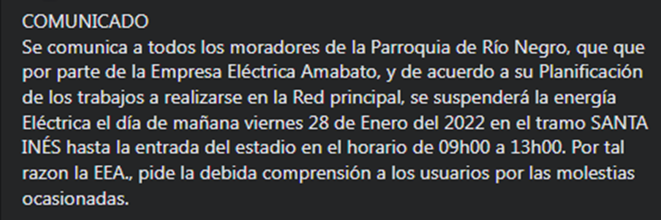 Se comunica a todos los moradores de la Parroquia de Río Negro, que que por parte de la Empresa Eléctrica Ambato, y de acuerdo a su Planificación de los trabajos a realizarse en la Red principal, se suspenderá la energía Eléctrica el día de mañana viernes 28 de Enero del 2022 en el tramo SANTA INÉS hasta la entrada del estadio en el horario de 09h00 a 13h00. Por tal razón la EEA., pide la debida comprensión a los usuarios por las molestias ocasionadas.