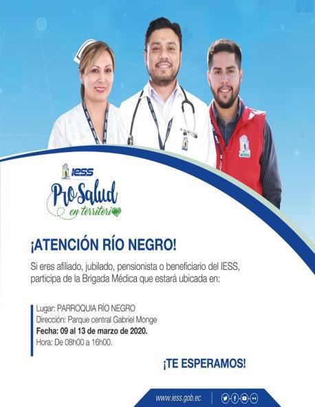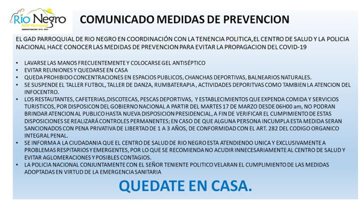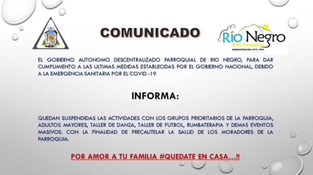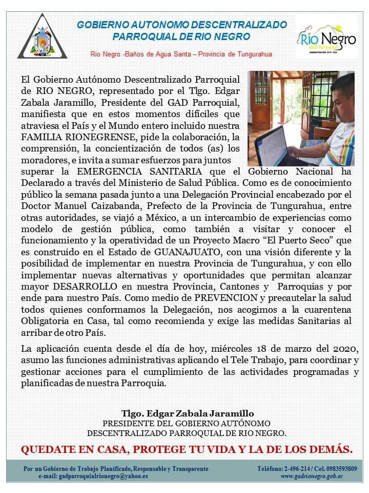 Edgar Zabala Jaramillo, Presidente del GAD Parroquial de RIO NEGRO, da ha conocer a la ciudadanía en especial a los moradores de la Parroquia, hoy en horas de la tarde se mantuvo una reunión de trabajo en Territorio, con la presencia del Dr. Luis Silva Luna, (Alcalde) Dra. Gabriela Aeropaja (Directora Distrito de Salud Baños) Sr. Diego Santamaría (Jefe Político - E), Sr. Oswaldo Muñoz (Vocal GADRN). El único tema que fue tratado y resuelto: Realizar un seguimiento y el aislamiento a todas las personas que mantuvieron contacto en los últimos días con el paciente que presenta positivo los resultados de laboratorio el contagio del CORONAVIRUS COVID-19 dentro de la Parroquia. Una vez abordado la reunión nos trasladamos con todo el equipo médico y tomando las medidas de Bioseguridad necesaria para a acudir a ciertas personas ya identificadas y realizar el compromiso de aislamiento voluntario que permanecerán dentro de sus hogares por los14 días establecidos. Como recomendación se les pide a todas la familia Rionegrense y a la ciudadanía en general, hacer más conciencia y la colaboración de todos, para así juntos aportar y superar esta Emergencia y volver a la calma y la tranquilidad de todos. "QUEDATE EN CASA" Informa.